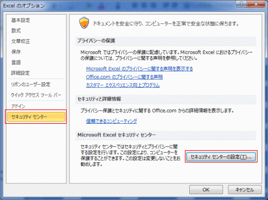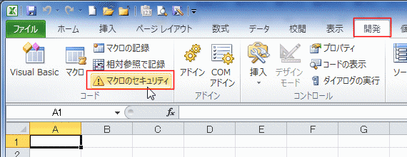 この辺の設定はExcel 2010では[セキュリティセンター]の[マクロの設定]や[信頼済みドキュメント]の設定によります。