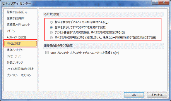 - マクロが無効になっています。また、マクロに関するセキュリティの警告も無効になります。