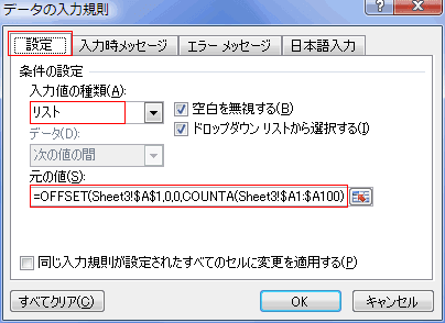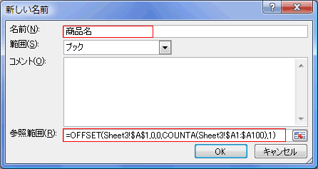 参照範囲に「=OFFSET(Sheet3!$A$1,0,0,COUNTA(Sheet3!$A1:$A100),1)」と入力しました。