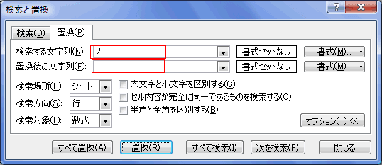 下図では「ノ」を「何もないもの」に置換する・・・ということですので、「ノ」が削除されます。