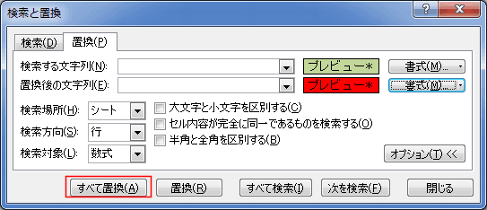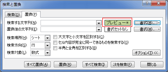 - 置換後の文字列の右側も「プレビュー*」と表示されていますので、[書式の右の[▼]ボタンをクリックし、[書式検索のクリア]を実行します。「書式セットなし」となりました。