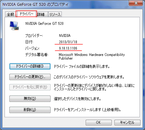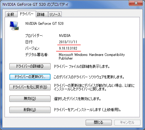 ドライバーのプロパティを見ると日付、バージョンから新しいものになっているのを確認できました。