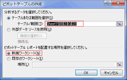 - [ピボットテーブルの作成]ダイアログでデータ範囲およびテーブルの配置する場所を設定します。