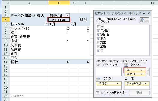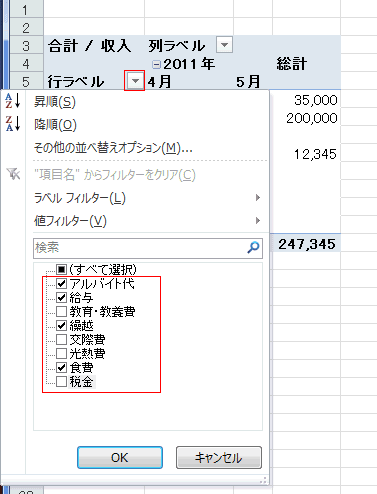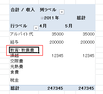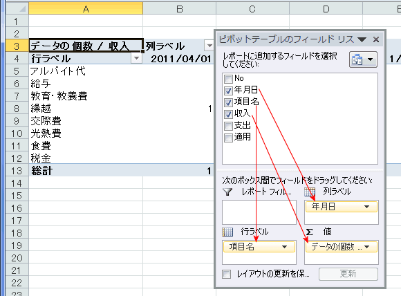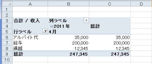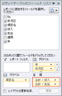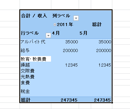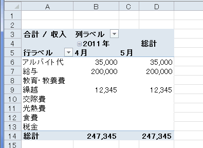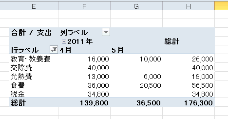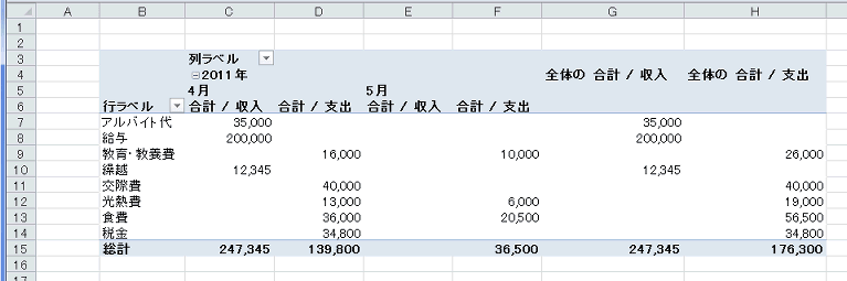 - 収入と支出を一つのピボットテーブルにすることもできます。
