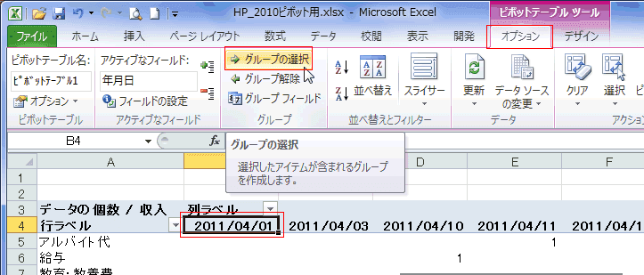 - [ピボットテーブル ツール]リボンの[オプション]タブで[グループの選択]を実行します。