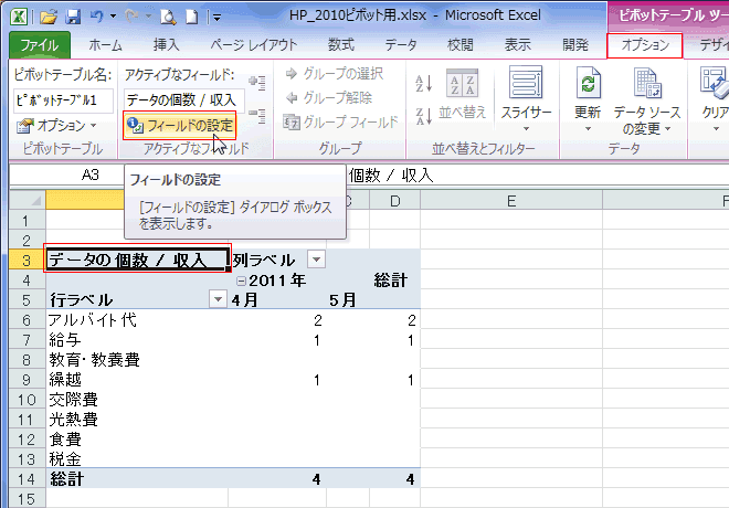 - [ピボットテーブルツール]リボンの[オプション]タブを選択し、[フィールドの設定]を実行します。