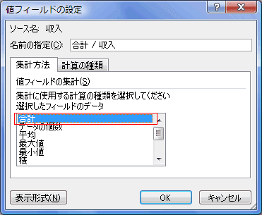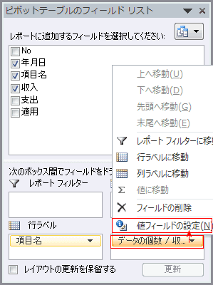 - フィールドリストの「データの個数/収入」をクリックして「値フィールドの設定」を選択することもできます。