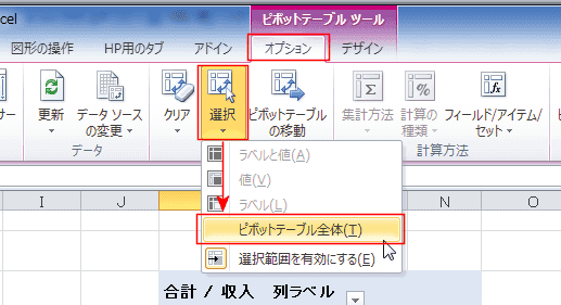 - ピボットテーブル ツールの[オプション]タブの[選択]→[テーブル全体]を選択します。