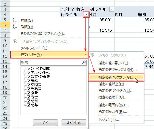 - 行ラベルの[▼]ボタンをクリックし、[値フィルター]→[指定の値より大きい]を選択します。