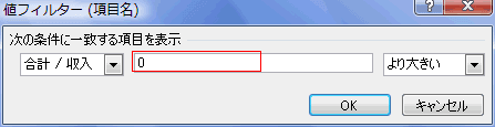 「合計/収入」が「0」「より大きい」という条件を設定します。