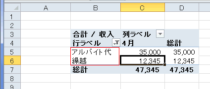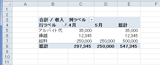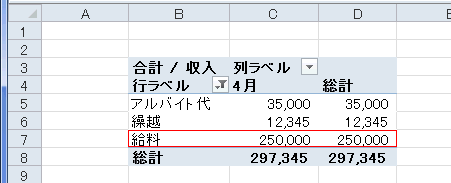 - ここではピボットテーブルの作成方法で作成した「収入」のピボットテーブルを使って説明します。