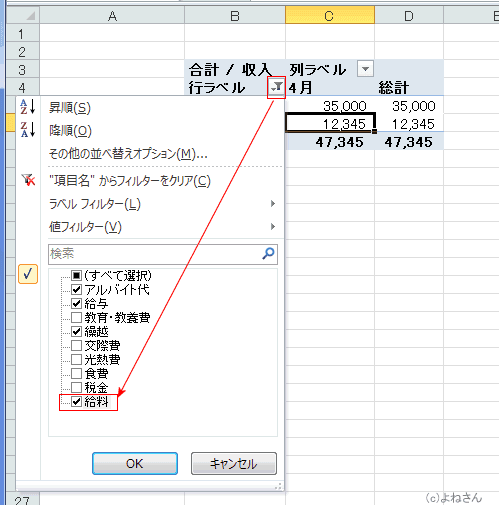 - 行ラベルの[手動フィルター]ボタンをクリックし、リスト内の表示したい[給料]にチェックを入れ、[OK]ボタンをクリックします。