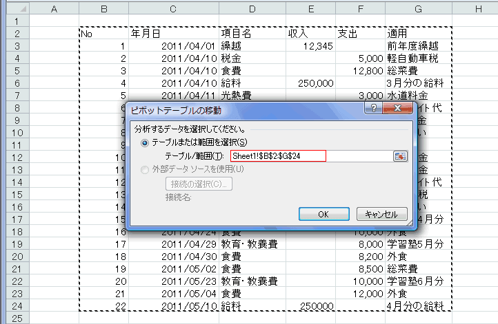 - テーブル/範囲 を適切なものに修正します。