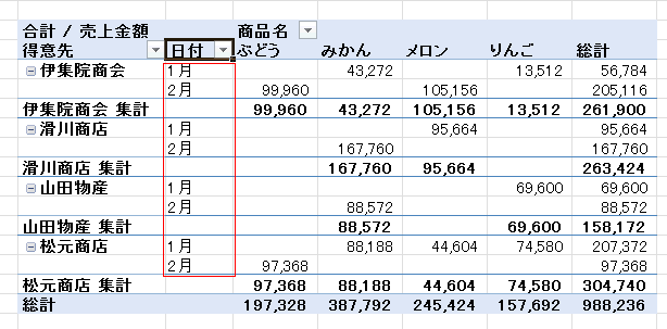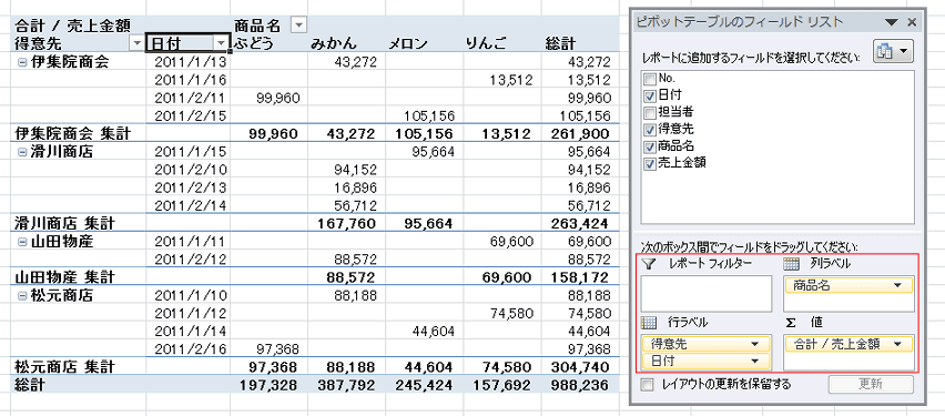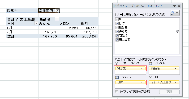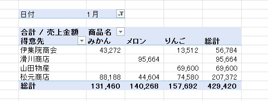 - レポートフィルターに「得意先」、行ラベルに「日付」と入れ替えると、得意先ごとのレポートが作成できます。