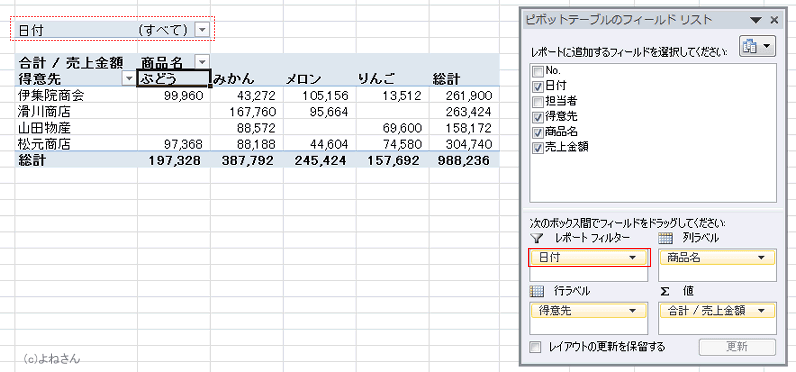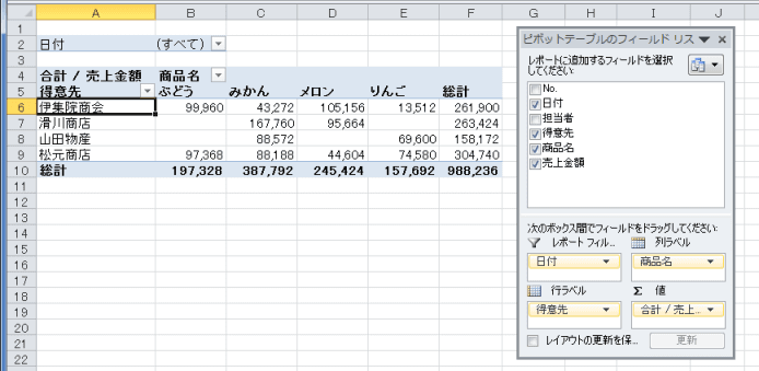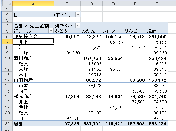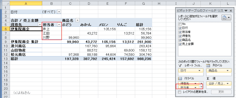 - 行ラベルに「担当者」フィールドが配置され、伊集院商会の担当者が表示されました。