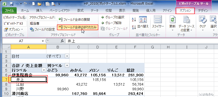 - 折りたたむには、折りたたみたいフィールドのいずれかのセルを選択します。