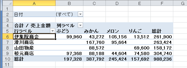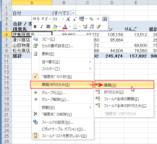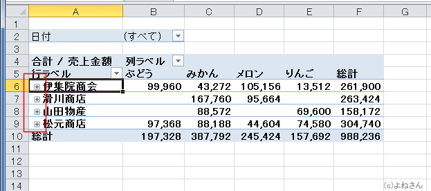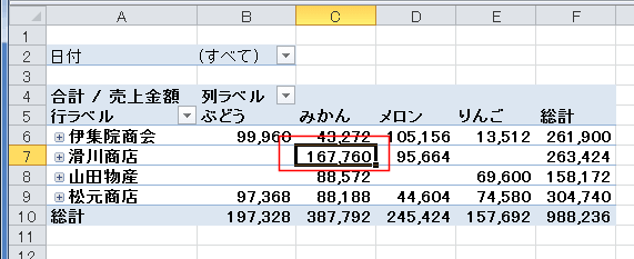 行ラベルに配置した得意先フィールドの「伊集院商会」セルをダブルクリックします。