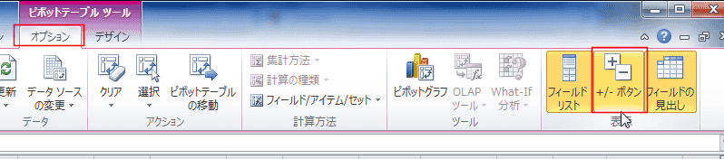 - ピボットテーブル ツールの[オプション]タブの[表示]グループの[+/-ボタン]をオンにすると、展開/折りたたみボタンが表示されます。