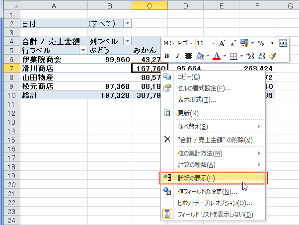 よねさんのExcelとWordの使い方|エクセル2010基本講座:目次|ピボットテーブルとピボットグラフ|詳細データの表示・詳細の表示(ピボットテーブル)