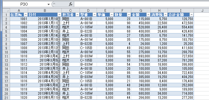 - ここでは、ピボットテーブルを利用してデータを新しいシートに抽出する方法です。(ドリルダウンと呼ばれる機能です。)