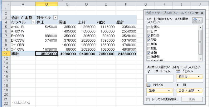 - 下図のように各フィールドを配置してピボットテーブルを作成しました。
