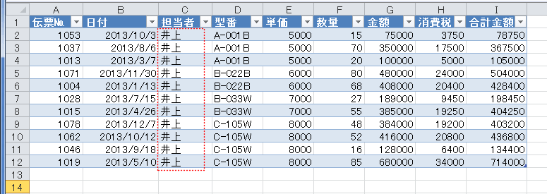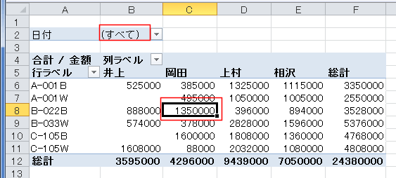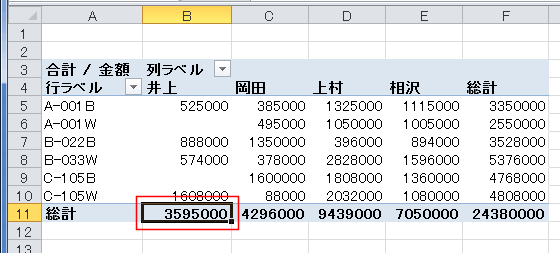 - 「井上」のすべてのデータを抽出したいので、総計が表示されているセルをダブルクリックします。