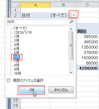 - レポートフィルターに配置した「日付」のフィルターボタンをクリックして、「6月」を選択します。[OK]ボタンをクリックします。