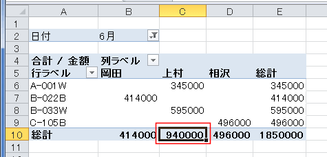 - 「上村」の総計が表示されているセルをダブルクリックします。