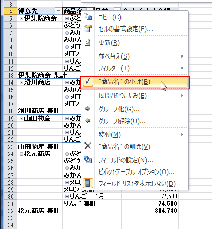 右クリックメニューに「”商品名”の小計」にチェックが入っています。