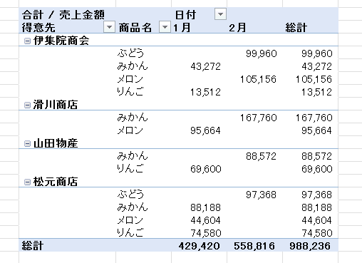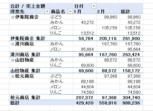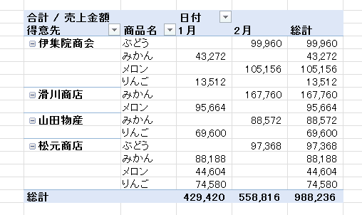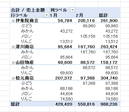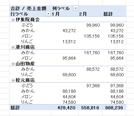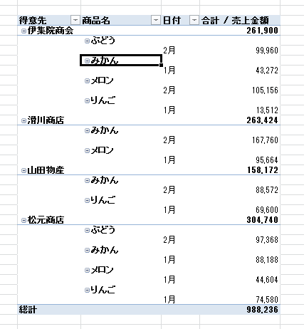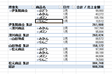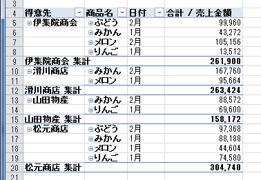 - ピボットテーブルのレイアウトによっては下図のように小計が表示されます。