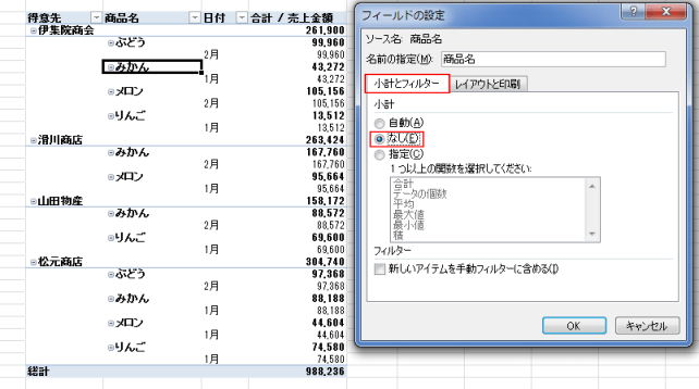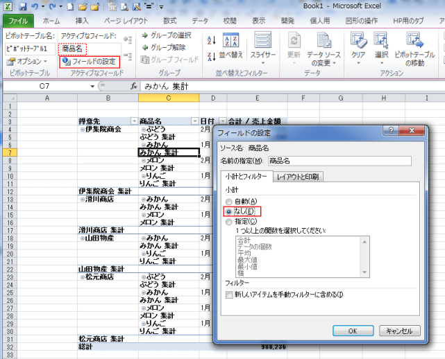 フィールドの設定から小計を非表示にする(表形式で表示している場合の例) topへ