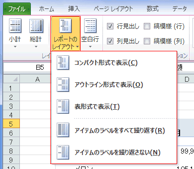 - レイアウトは[ピボットテーブルツール]リボンの[デザイン]タブでレイアウトグループの[レポートのレイアウト]から変更できます。
