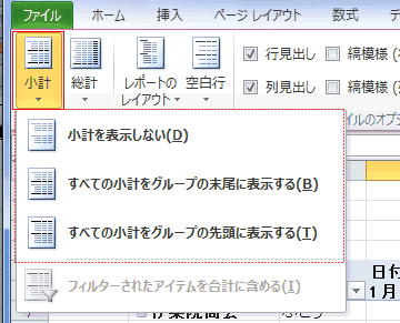 - 小計の表示位置は[ピボットテーブルツール]リボンの[デザイン]タブでレイアウトグループの[小計]から変更できます。