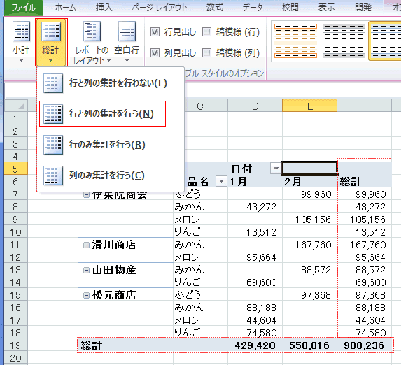 - 下図は「行と列の集計を行う」を実行した状態です。総計の行と列が表示されています。
