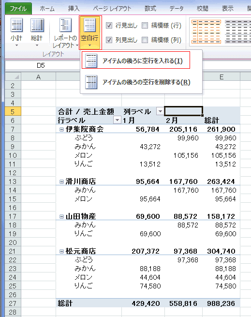 - [ピボットテーブルツール]リボンの[デザイン]タブでレイアウトグループの[空白行]から変更できます。