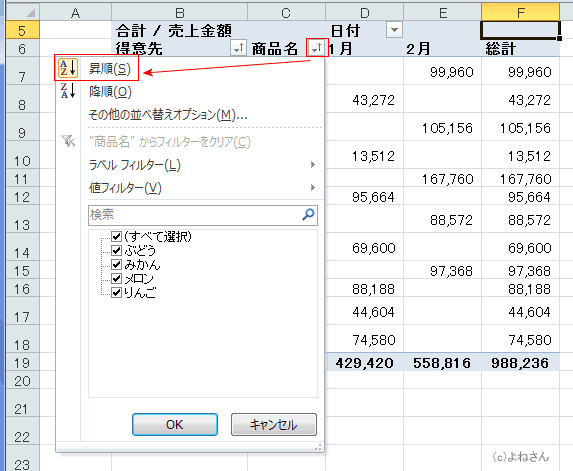 - 「行ラベル」または「列ラベル」のボタンをクリックし、フィールドを選択して「昇順」や「降順」などを実行します。