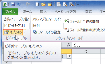 - ピボットテーブル ツールの[オプション]タブを選択して、[オプション]をクリックします。