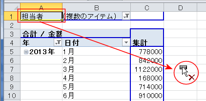 - フィールドの削除はピボットテーブルのグリッド外へドラッグすることで実行できるようになります。