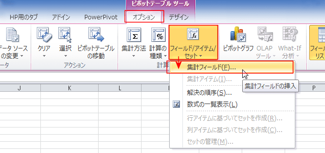 [フィールド/アイテム/セット]→[集計フィールド]を選択します。
