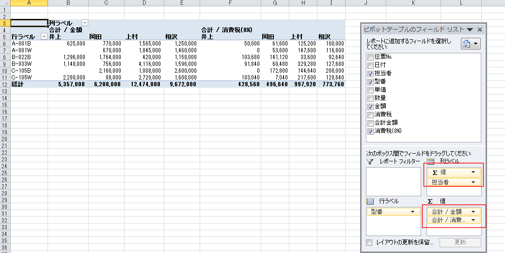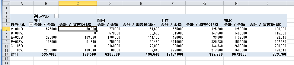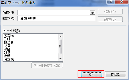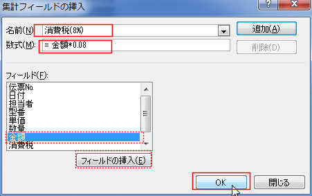- このピボットテーブルのレポーに消費税の計算をするフィールドを追加してみます。