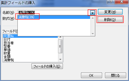 - 削除したい集計フィールドを選択して、[削除]ボタンをクリックします。