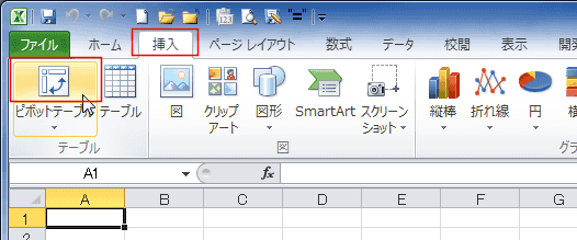 - [挿入]タブの[ピボットテーブル]をクリックします。