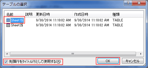 - データのあるシートを選択します。ここでは「Sheet1$」を選択しています。