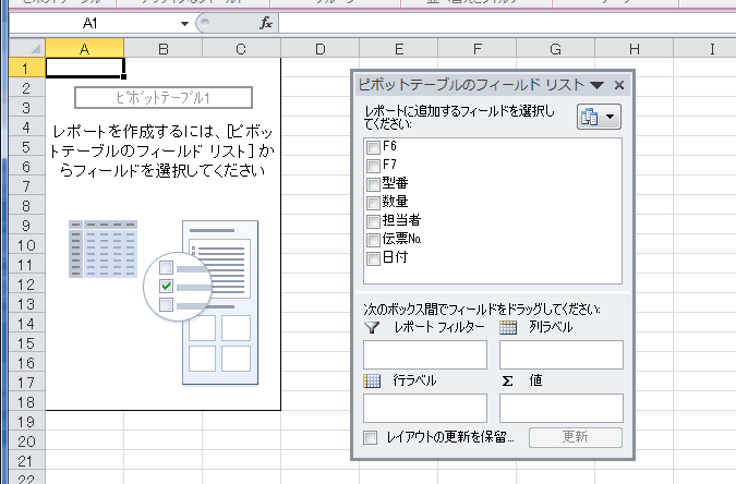 - フィールドリストに「F6」「F7」といったフィールドが表示されています、これは、基にしたデータファイルの列見出しが未入力であるためです。