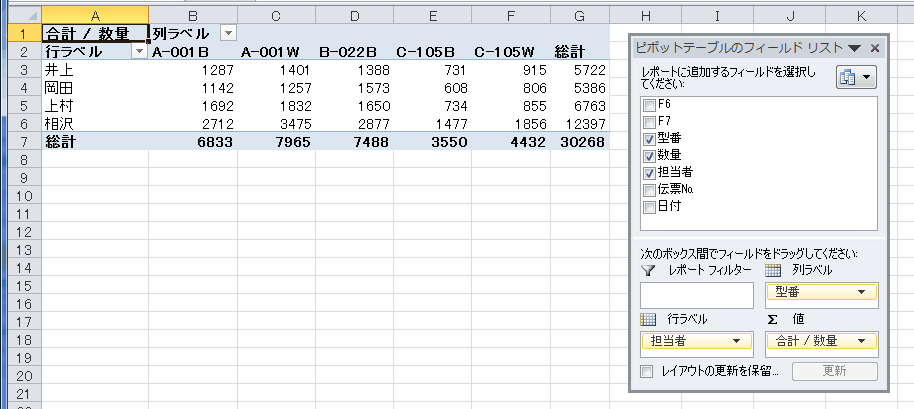 - 行ラベルに「担当者」、列レベルに「型番」、Σ値に「合計/数量」を配置した例です。