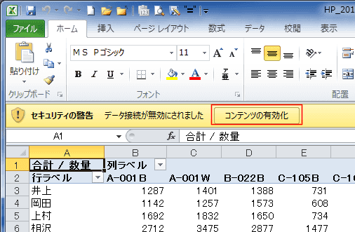 - セキュリティの警告が表示されました。[コンテンツの有効化]ボタンをクリックします。