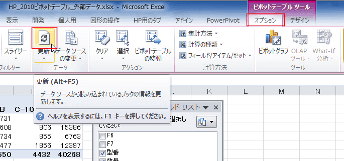 - このとき、外部ファイルが変更されているときは、ピボットテーブル ツールの[オプション]タブの[更新]を実行する必要があります。