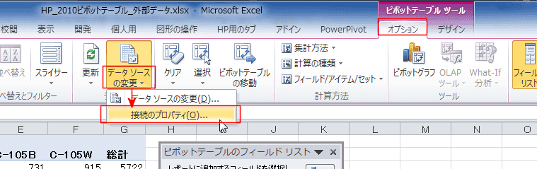- ピボットテーブル ツールの[オプション]タブの[データソースの変更]→[接続のプロパティ]を実行します。