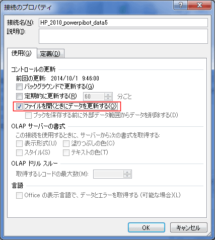 - ここでは、「ファイルを開くときにデータを更新する」にチェックを入れました。