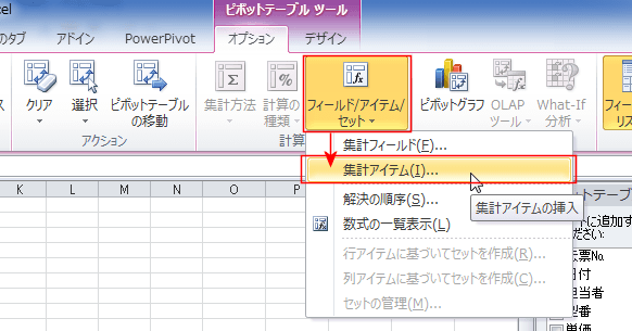 [フィールド/アイテム/セット]→[集計アイテム]を選択します。